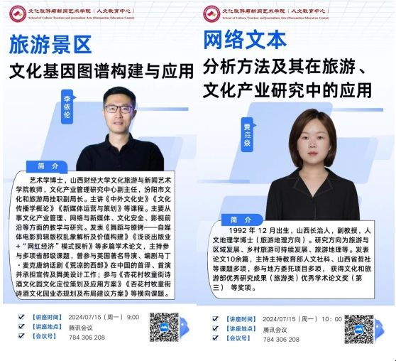 7月15日上午9点,文化产业管理和旅游管理的同学们迎来了此次“小学期”的第二场讲座,文化产业管理研究中心副主任李依伦老师和副教授贾垚焱老师分别为学生们带来了精彩的讲授,为时3小时。此次讲座,为了让同学们更好的传承和弘扬中华优秀传统文化,李老师以旅游景区文化基因图谱构建与应用为主题,从编制意义,相关概念,分类模式,基本架构和应用五个方面介绍了文化基因图谱,为传统文化的研究,传承与弘扬开辟了新路径。