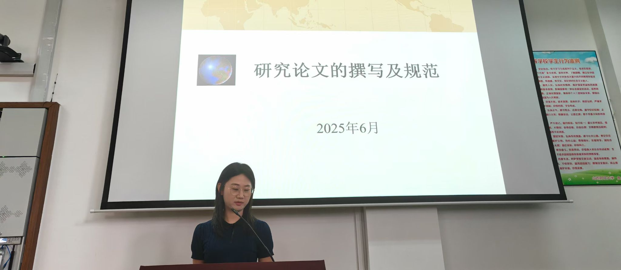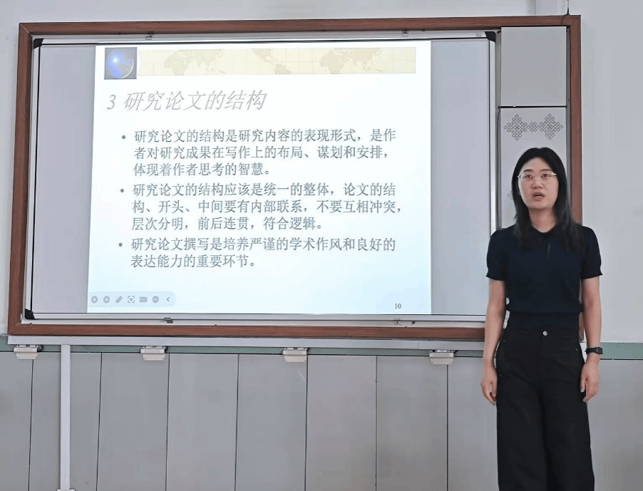 “论文写作是一场思维的马拉松”。李新越结合自身经验,分享了论文写作的全过程:从资料收集、选题构思、提纲编写,到初稿撰写和修改定稿。她建议同学们在写作前广泛阅读文献,选择有价值且适合自身能力的课题;在写作中注重观点与材料的统一,确保逻辑连贯;在修改阶段反复打磨,力求简洁明了,突出重点,表达核心观点。