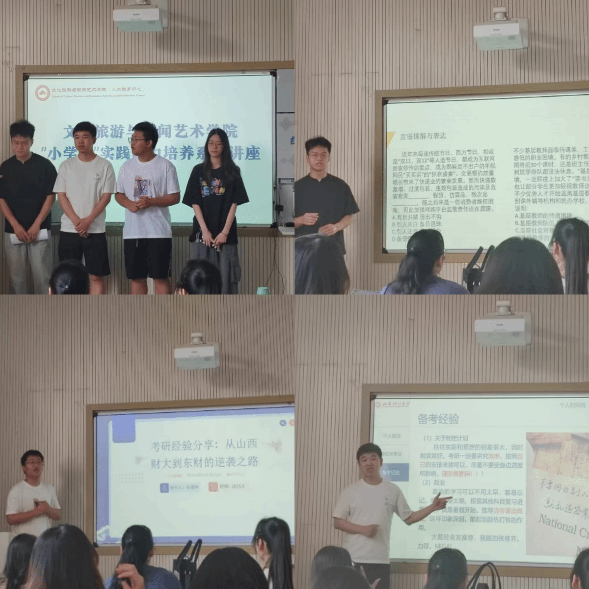 张新成老师主持,特邀四位成功考取研究生或公务员的优秀毕业生代表担任主讲嘉宾。他们结合自身上岸经验,针对不同发展方向进行了深度剖析与策略指导,为面临升学就业关键抉择的大三学子提供了宝贵指引。