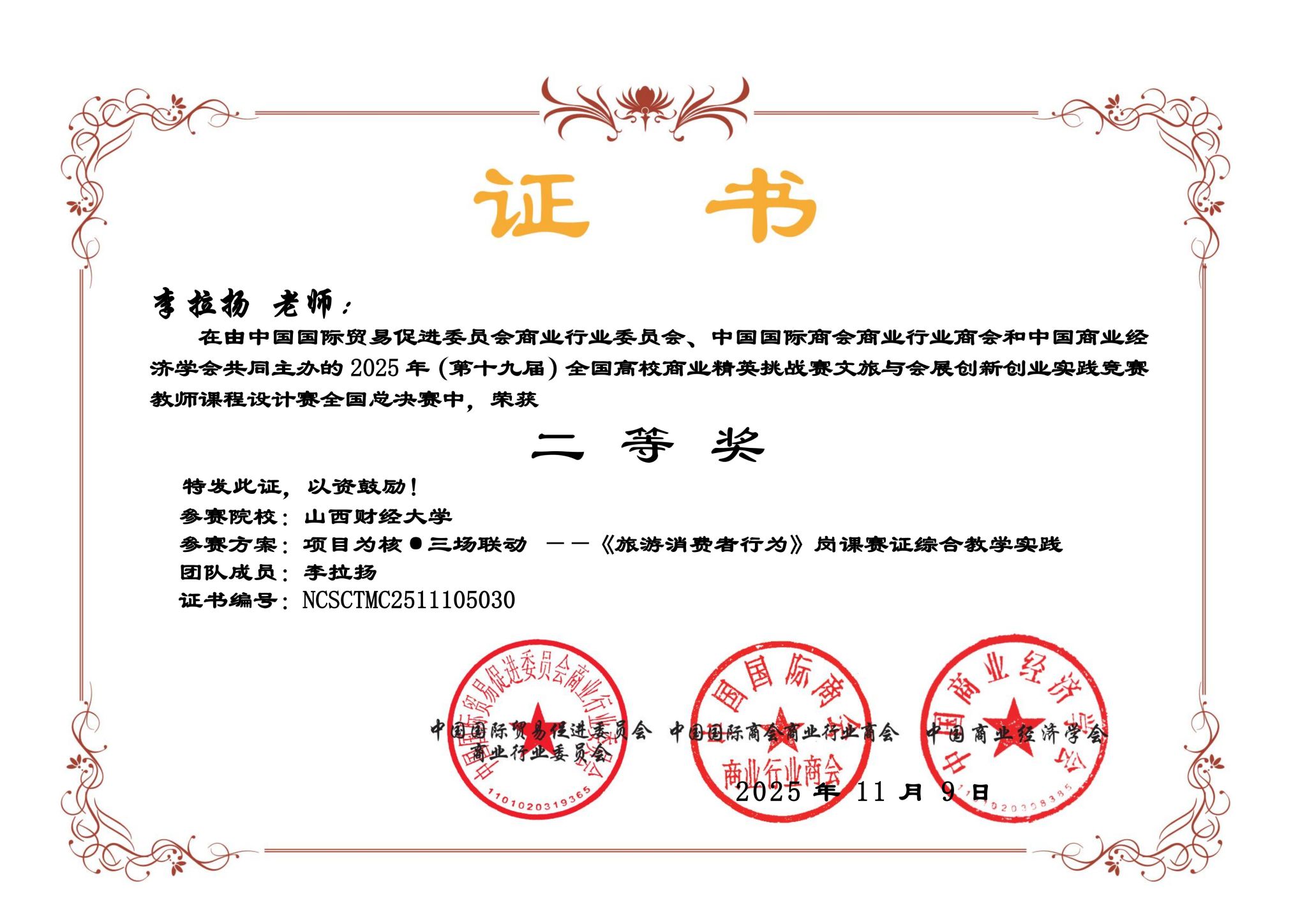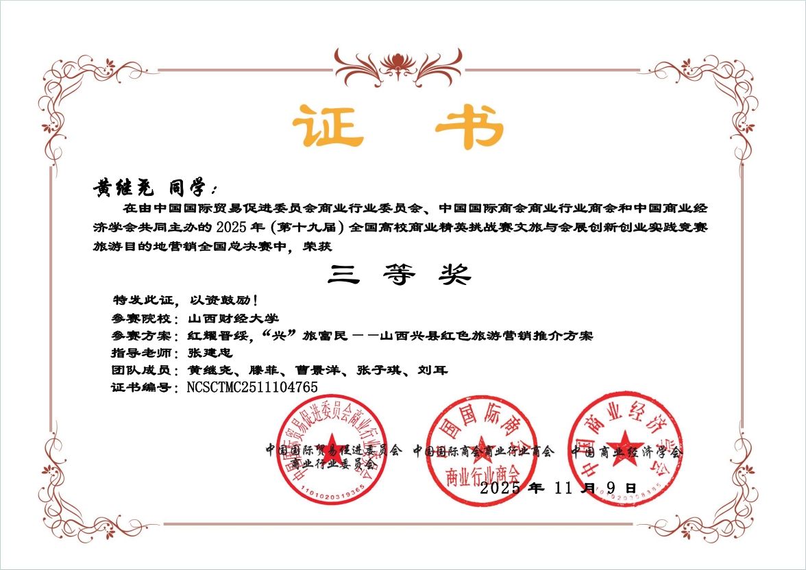 旅游管理专业李拉扬老师的《旅游消费者行为》课程经过说课、现场答辩获得全国二等奖。由李拉扬老师指导,汤海姝、李昀择、孙嘉欣的参赛作品《皂林研学·自然课—西毛家皂村森林研学发展规划》获得旅游新业态策划赛道全国三等奖。由张建忠老师指导,黄继尧、滕菲、曹景洋、张子琪、刘耳的参赛作品《红耀晋绥,“兴”旅富民——山西兴县红色旅游营销推介方案》获得旅游目的地营销赛道全国三等奖。