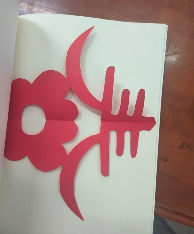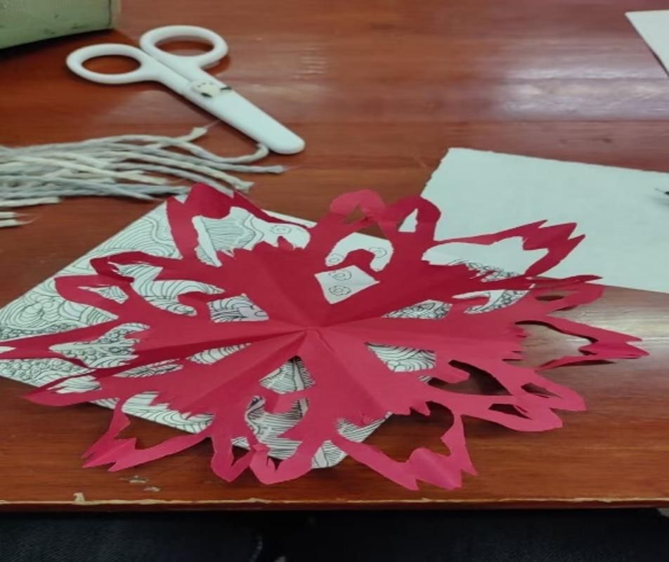 同学们围坐一堂,红纸、剪刀等工具整齐摆放,跃跃欲试。在教师的指导下,大家先从简单的对折、三角折剪学起,认真揣摩折叠角度与剪刻力度,指尖的生涩在反复练习中逐渐褪去。对照着发放的基础纹样模板,同学们凝神专注,或剪或刻。遇到折剪不规整时,教师巡回指导,手把手纠正技法,耐心解答疑问。当第一幅完整的团花作品成功出炉,同学们脸上洋溢着满满的成就感,创作热情愈发高涨。