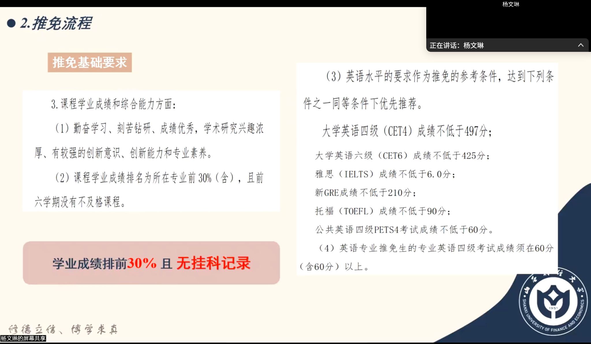 推免资格,经审核、答辩与综合评议后获得推荐资格;9-10月参加目标院校复试完成录取。她特别强调各环节时间节点紧密衔接,需主动关注研究生院官网通知。