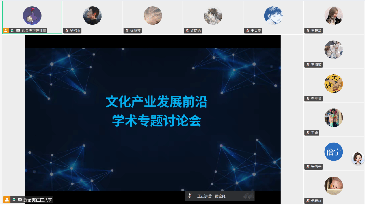 2026 年 1 月 23日 15:00-16:00,文化产业管理教研室以云端会议形式成功举办 “文化产业发展前沿” 学术专题讨论会。本次活动作为小学期科研训练类实践项目的核心环节,旨在帮助学生深入把握学科前沿动态、熟练掌握科研项目方法,着力培养严谨的科学态度与高效的团队合作精神。文化产业管理教研室教师及 2023、2024、2025 级本专业本科生齐聚线上,共同参与这场学术交流盛宴。